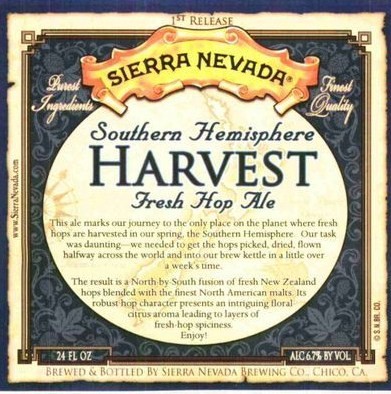 The newest addition to Sierra Nevada’s Harvest family is Southern Hemisphere Harvest- 2010. This is thought to be the first time that an American brewer has put out a beer with fresh-picked hops from the southern hemisphere. The fresh hops in this beer are dried right after being picked and flown immediately from New Zealand to Chico for brewing so that they retain their peak aromatics and flavors.